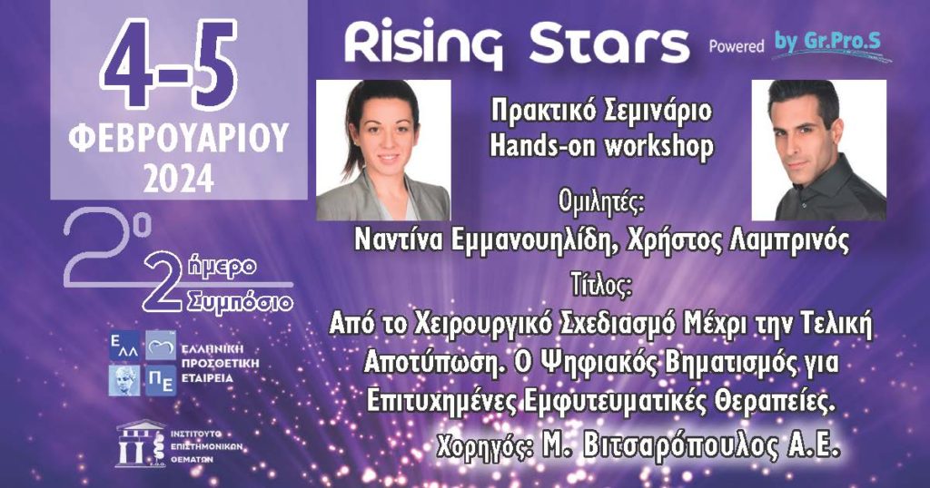 H Ελληνική Προσθετική Εταιρεία σας προσκαλεί στο 2ο Διήμερο Συμπόσιο RISING STARS powered by GrProS στην Αμφιθέατρο της Οδοντιατρικής Σχολής ΕΚΠΑ, στις 3 και 4 Φεβρουαρίου 2024.